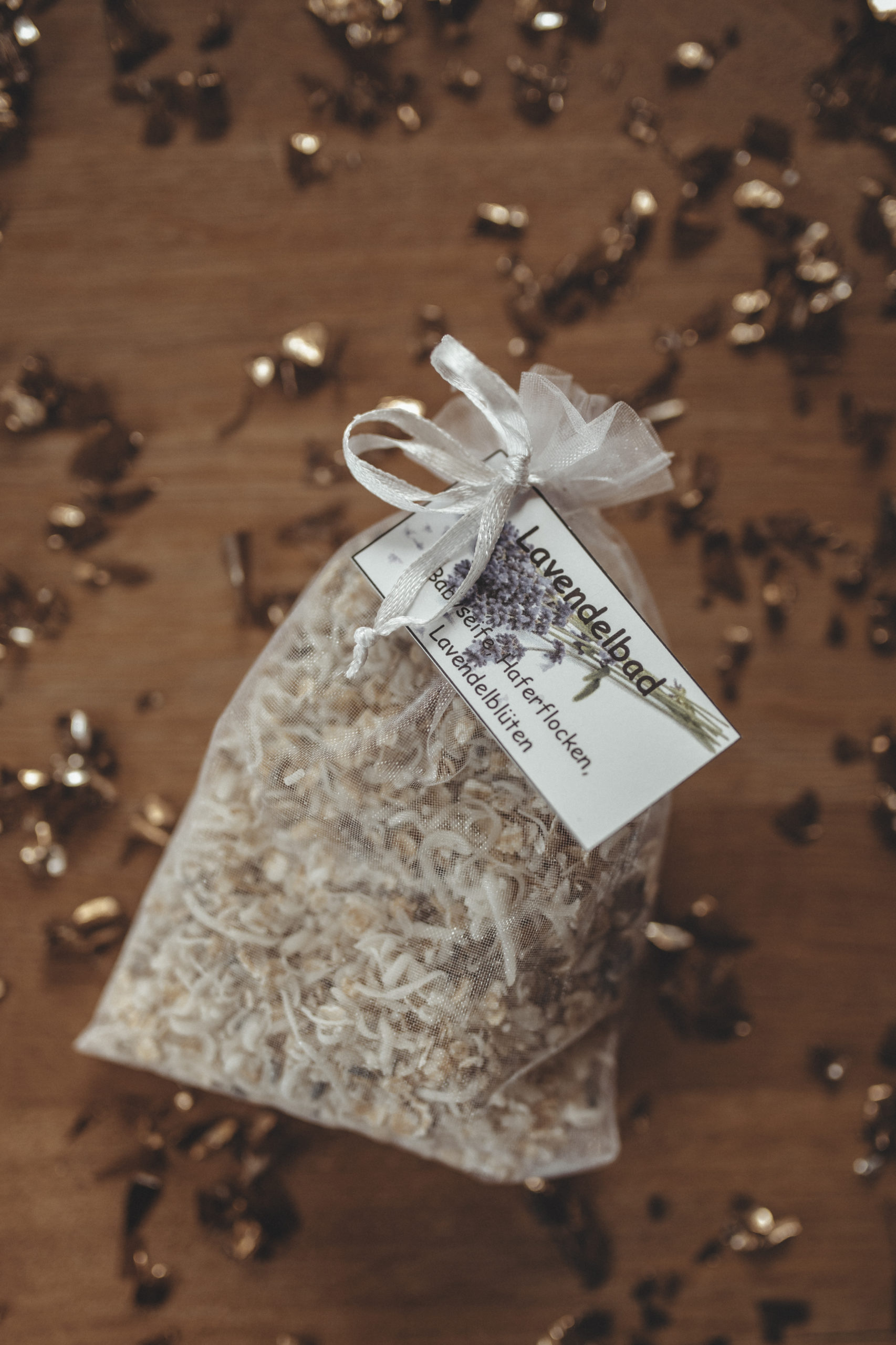 1 Badesäckchen: mit Haferflocken, Lavendelblüten, geriebener Kinderseife. Es ist ein milder, beruhigender Badezusatz für 2-3 Bäder.