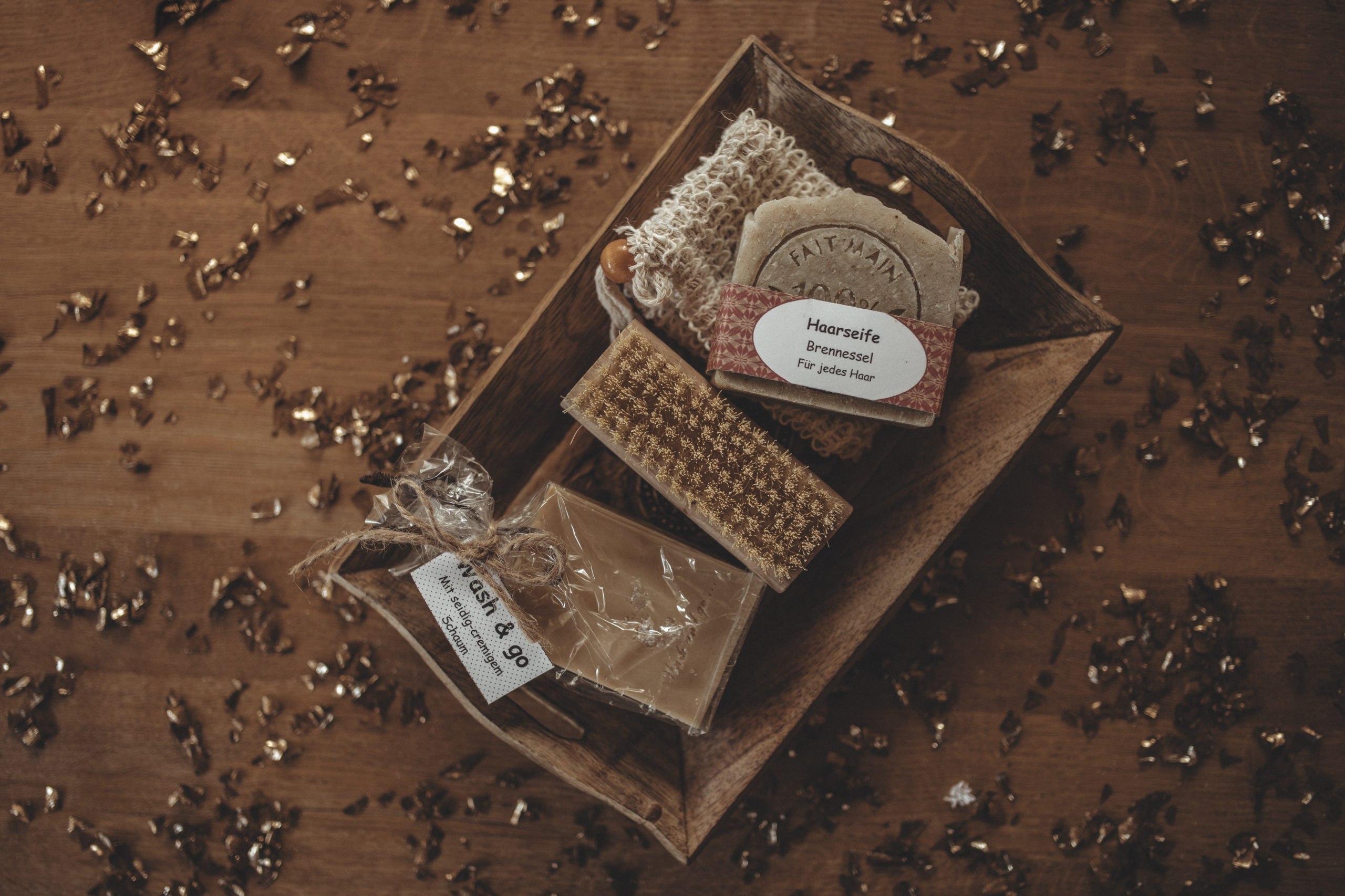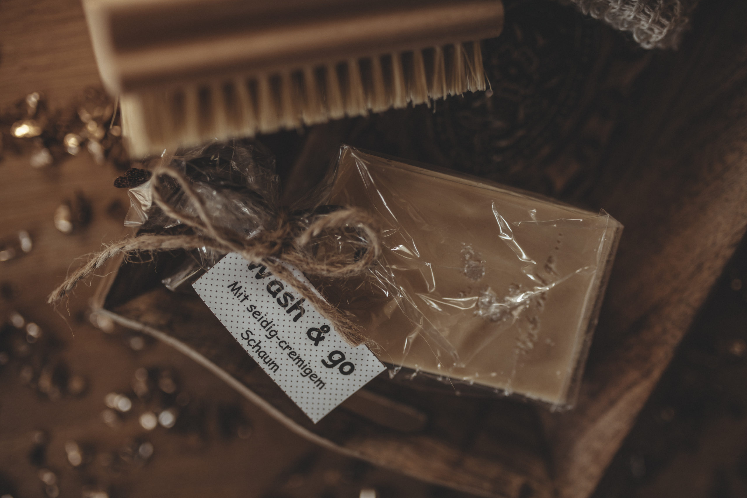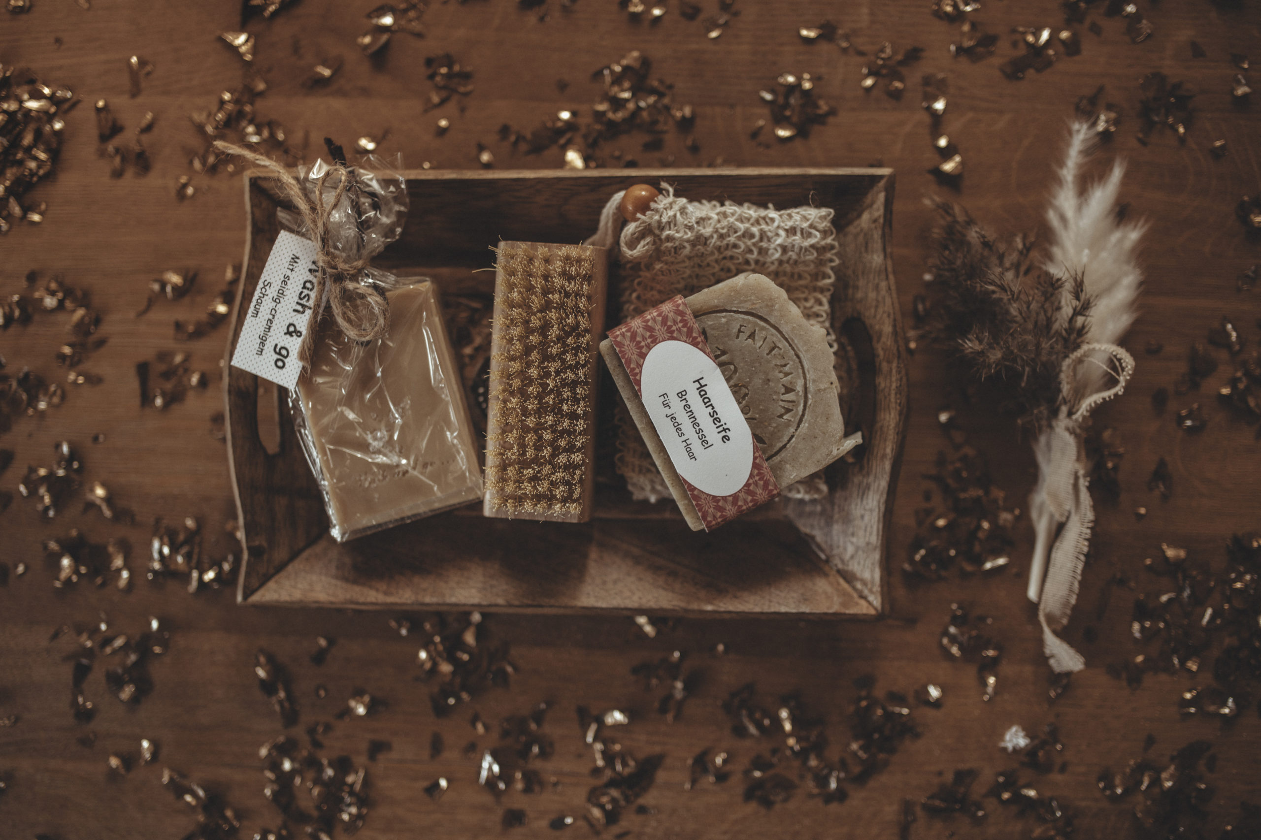 Dazu ein praktisches Hand und Nagelbürsteli und ein Sisal Seifensäckli. Das ganze kommt auf einem Holztablettli und mit durchsichtiger Folie eingepackt zu ihnen.